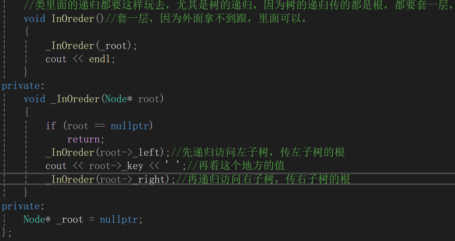 void InOreder()//套一层,因为外面拿不到跟,里面可以,