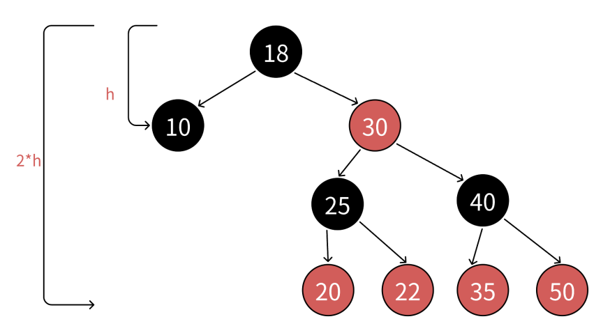 • 由规则 2 和规则 3 可知,任意一条路径不会有连续的红色结点,所以极端场景下,最长的路径就是一黑一红间隔组成,那么最长路径的长度为 2*bh