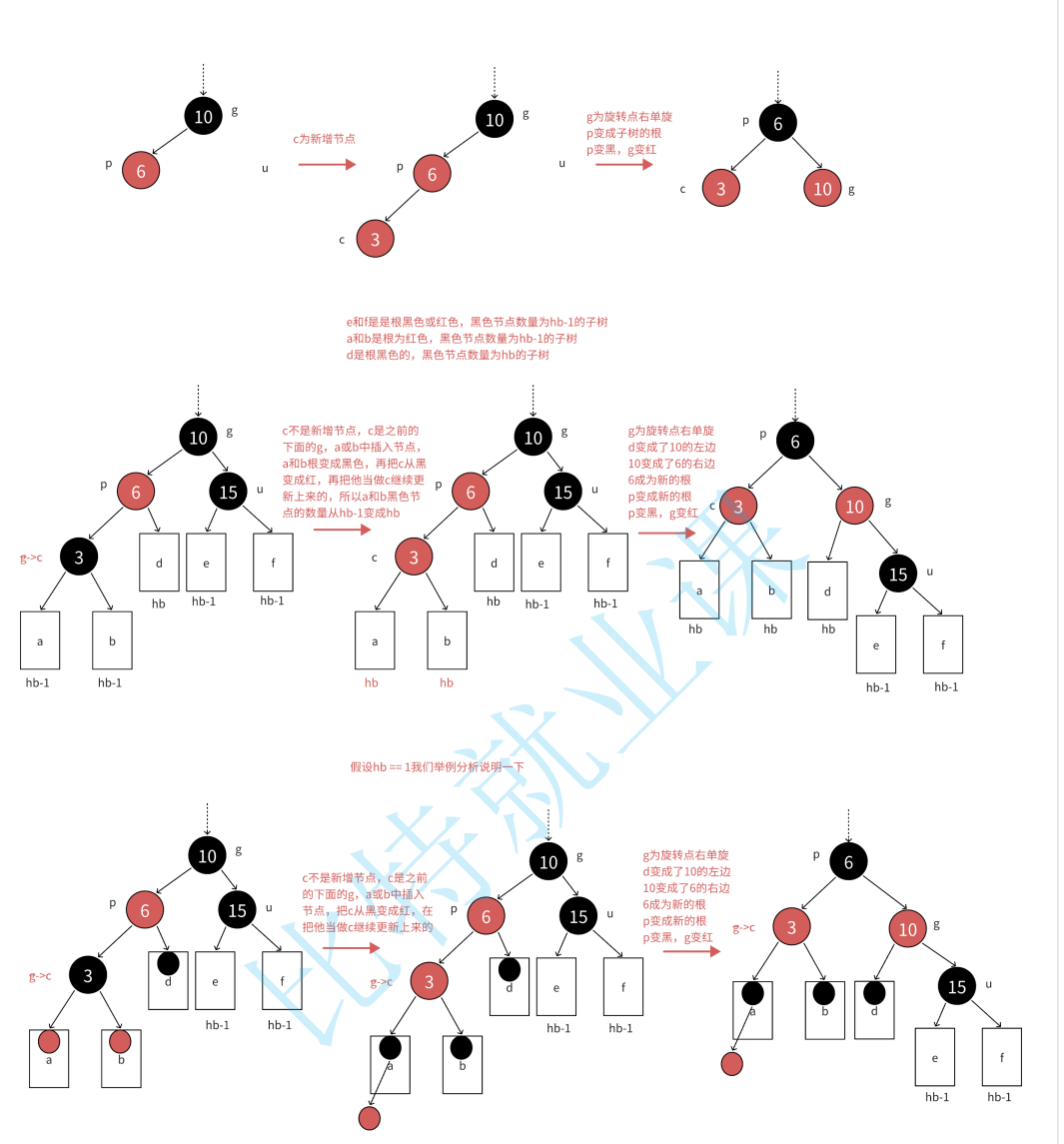 如下图:将以上类似的处理进行了抽象表达,d/e/f代表每条路径拥有hb个黑色结点的子树,a/b代表每条路径拥有hb-1个黑色结点的根为红的子树,hb>=0