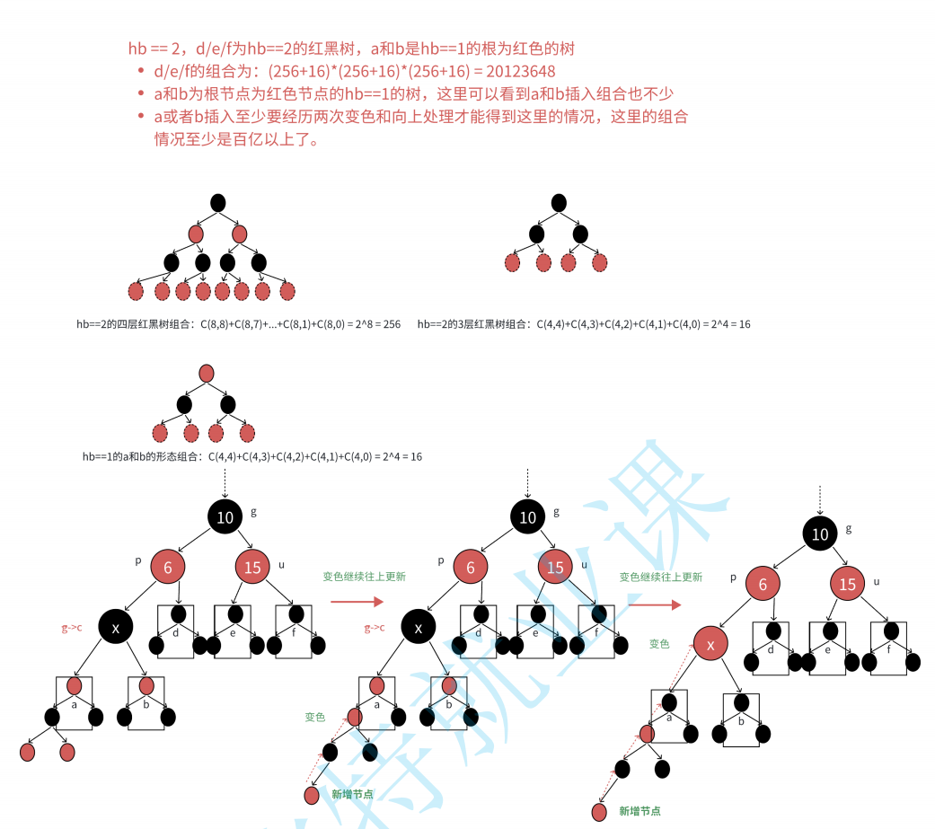 下面分别展示了hb == 0/hb == 1/hb == 2的具体情况组合分析,当hb等于2时,这里组合情况上百亿种,这些样例是帮助我们理解,不论情况多少种,多么复杂,处理方式一样的,变色再继续往上处理即可,所以我们只需要看抽象图即可