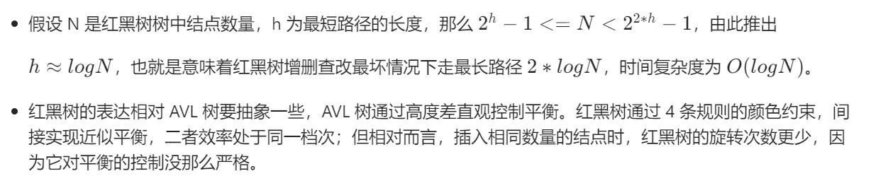 • 综合红黑树的 4 点规则而言,理论上的全黑最短路径和一黑一红的最长路径并不是在每棵红黑树都存在的。假设任意一条从根到 NULL 结点路径的长度为 x,那么 bh <= h <= 2*bh