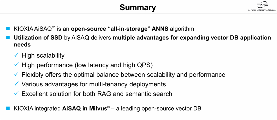 总结页凝聚了整个演示文稿的核心信息。它强调 KIOXIA AiSAQ™ 是一款开源的、革命性的“全闪存”ANNS算法,其核心创新在于充分利用SSD来替代昂贵的DRAM。