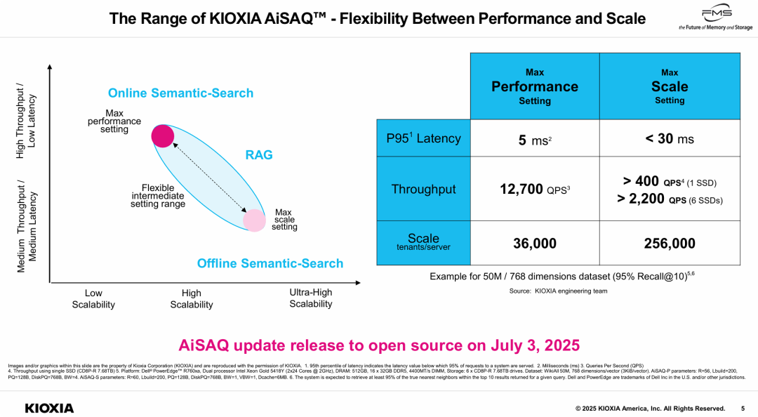 KIOXIA AiSAQ通过提供“灵活的设置”(Flexible setting)和“可调优”(Tunable)的能力,允许用户可以根据自己应用的具体需求,在“最大规模”和“最大吞吐量”之间找到一个“最佳平衡点”(optimal point)。