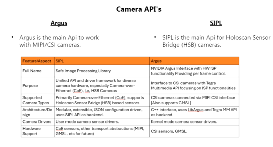 关于摄像头API,针对直接与我们的SoC(片上系统)接口对接的MIPI CSI摄像头,我们此前一直提供Argus库及其专属API,用于支持其在应用中的运行——这一传统支持方式在最新的JetPack中依然有效。
