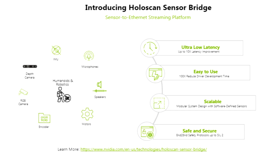 该平台的首个核心优势是“超低延迟”。上述多数应用场景(如人形机器人控制)需要将传感器数据极速传输至GPU内存,而Holliscan传感器桥接平台能以最低的延迟实现这一目标,确保实时性。