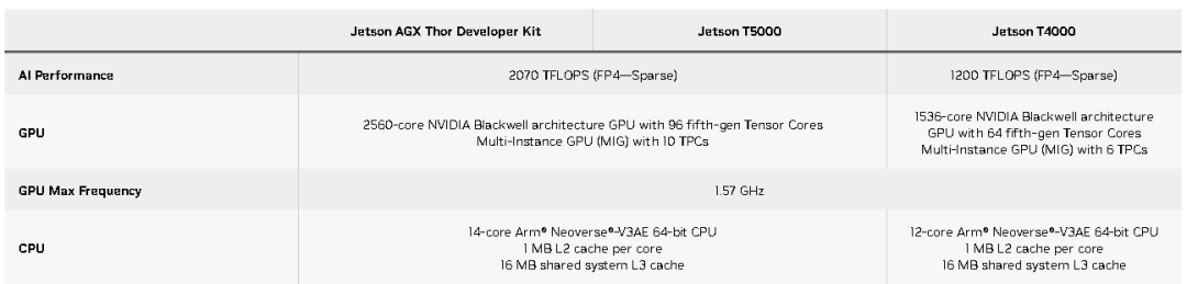 从计算规格来看,与Orin相比,Thor有着显著提升 —— 从Orin的2048个安培架构CUDA核心,到Thor T5000上配备的2560个最先进的Blackwell架构GPU,它能实现高达2040 TFLOPS的FP4性能,处于同类产品的最佳水平。