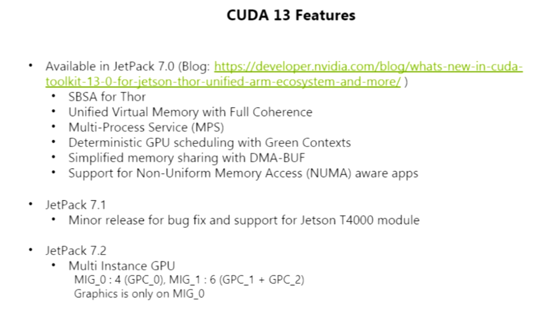 CUDA 13是JetPack 7.0的另一大亮点——这是CUDA工具链的最新版本。我们针对CUDA 13的功能,大部分新特性都已集成到JetPack 7.0中。比如SBSA的相关支持已涵盖,多进程服务(Multi-Process Services)也已在我们的Jetson平台上实现。