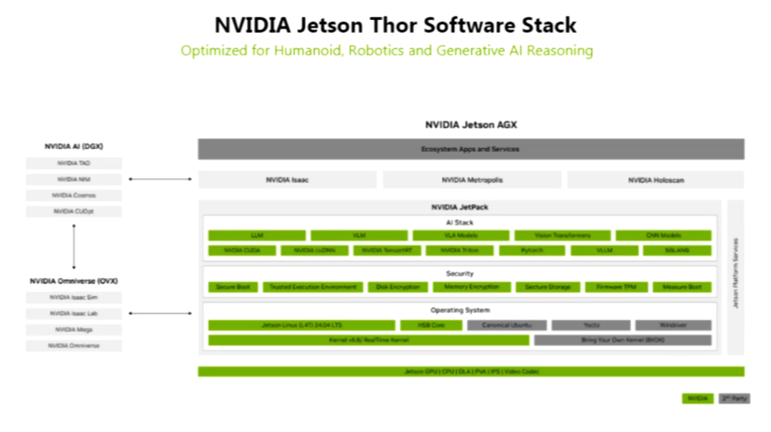 除此之外,英伟达还针对Jetson这款边缘AI计算机,提供了专门的软件。比如,我们基于Ubuntu 24推出了Jetson Linux操作系统(BSP即板级支持包),其中包含了所有定制化的内核驱动,以确保硬件能够正常运行。安全问题至关重要,因为Jetson最终会部署到客户的实际产品中,所以我们对此高度重视,并提供了相应的安全解决方案。
