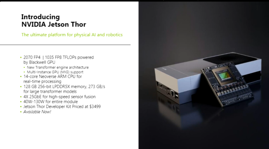Thor是物理人工智能与机器人领域的终极平台,它的性能极为强大——这是目前全球综合表现最优异的处理器:在如此小巧的体积内,它拥有最高的算力密度。具体来说,它搭载了基于Blackwell架构的GPU,最高可提供2070 TFLOPS(FP8精度)的算力,支持新一代Transformer模型运算;同时具备独创的“即时GPU实例化”功能,能将GPU虚拟划分为两个独立实例,实现工作负载隔离。