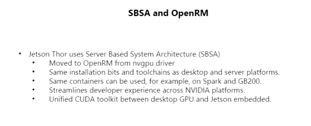 如今,Jetson Thor终于实现了基于SBSA(服务器基础系统架构)的系统架构。这一升级得益于我们为Jetson全新研发的新型GPU驱动——OpenRM驱动。