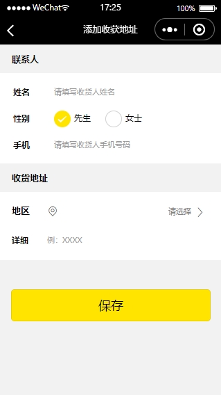 5.地址选择:用户登录小程序后可以修改并保存自己常用的收货地址,这样就不必在下次下单时重复填写,只需要选择地址即可,节省了点餐时间和步骤。