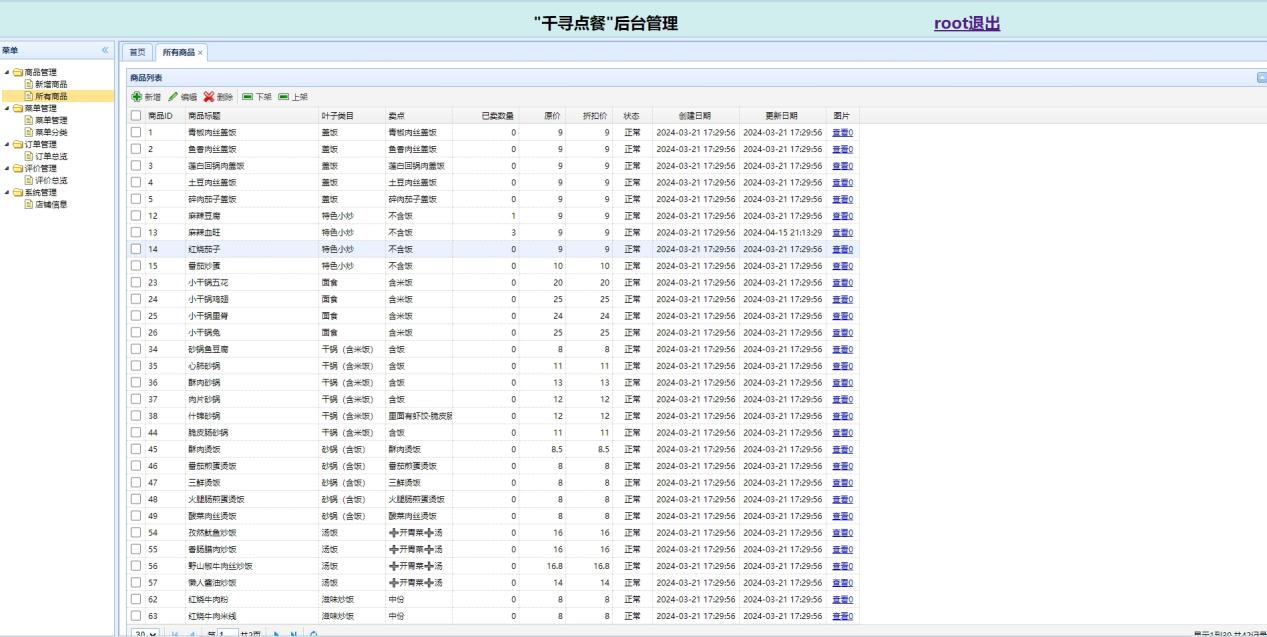 7.后台菜品:本系统中菜品管理是一个不可或缺的重要功能,可以添加菜品信息、查看当前上市菜品、删除菜品等页面,简单而高效。