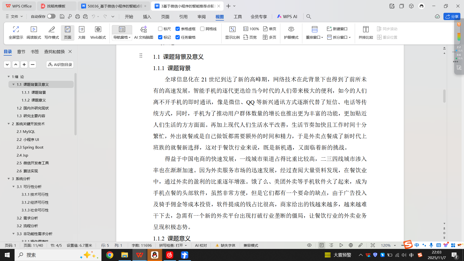 本课题是针对外卖点餐小程序的设计,该外卖点餐小程序实现了一个外卖点餐终端的功能,如:外卖点餐、菜品管理、订单管理、评价管理及统计分析等。本设计采用微信开发者工具进行开发,功能齐全,能够正常运行,各个界面交互性较好,使用方便,可大大提高服务质量,并节省许多人力物力。