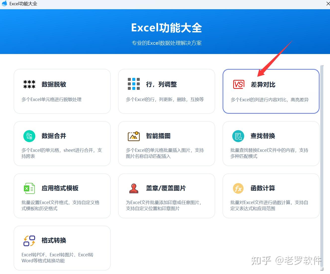 这是一个专业解决excel多文件处理的方案, 找到 Excel功能大全, 然后在弹出的框里点击 ”差异对比“