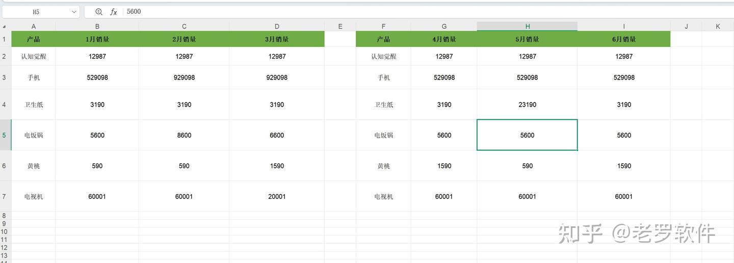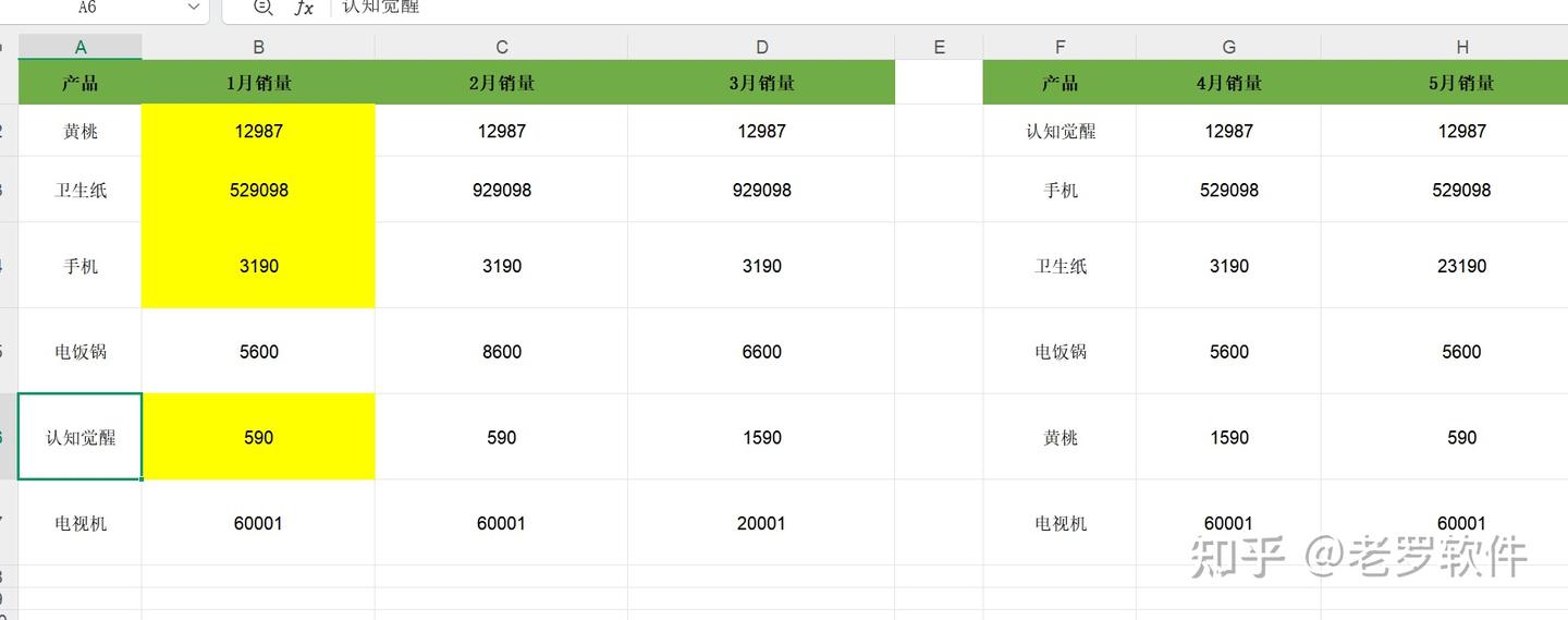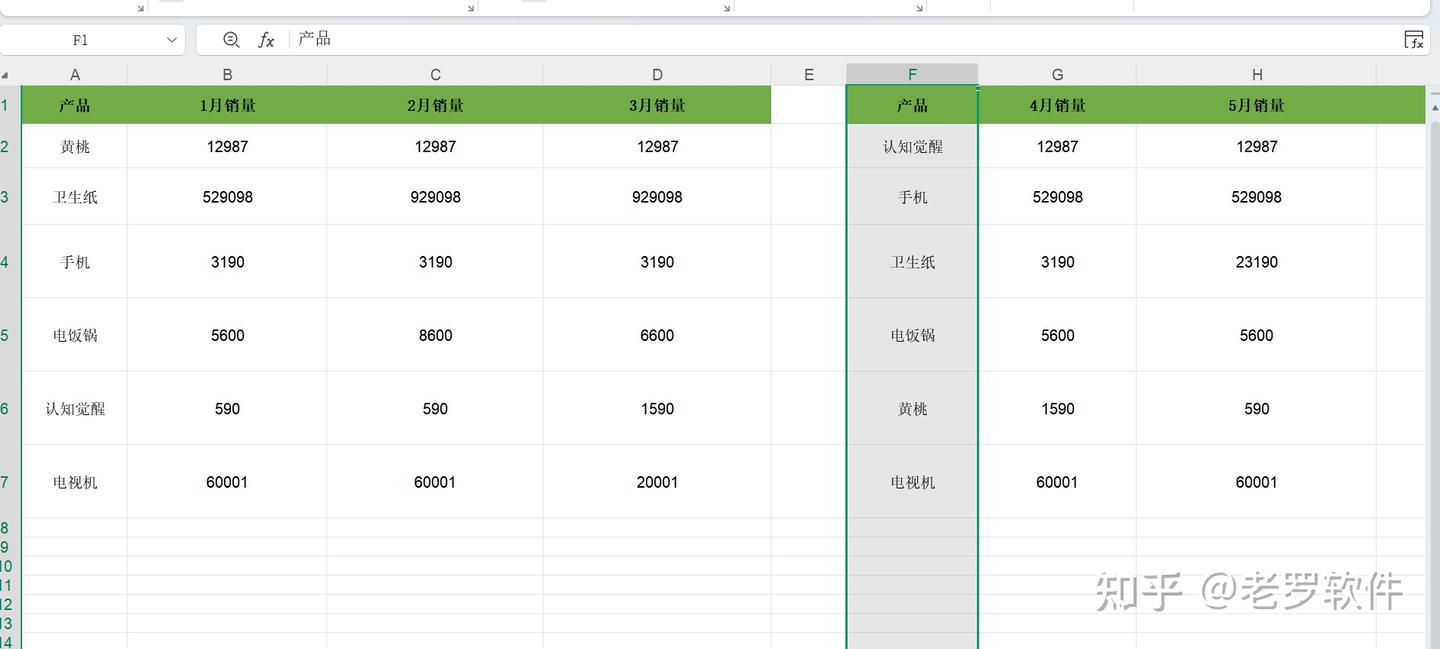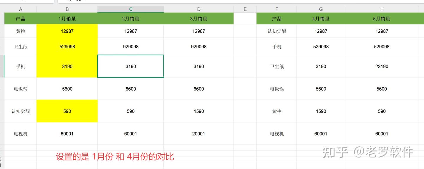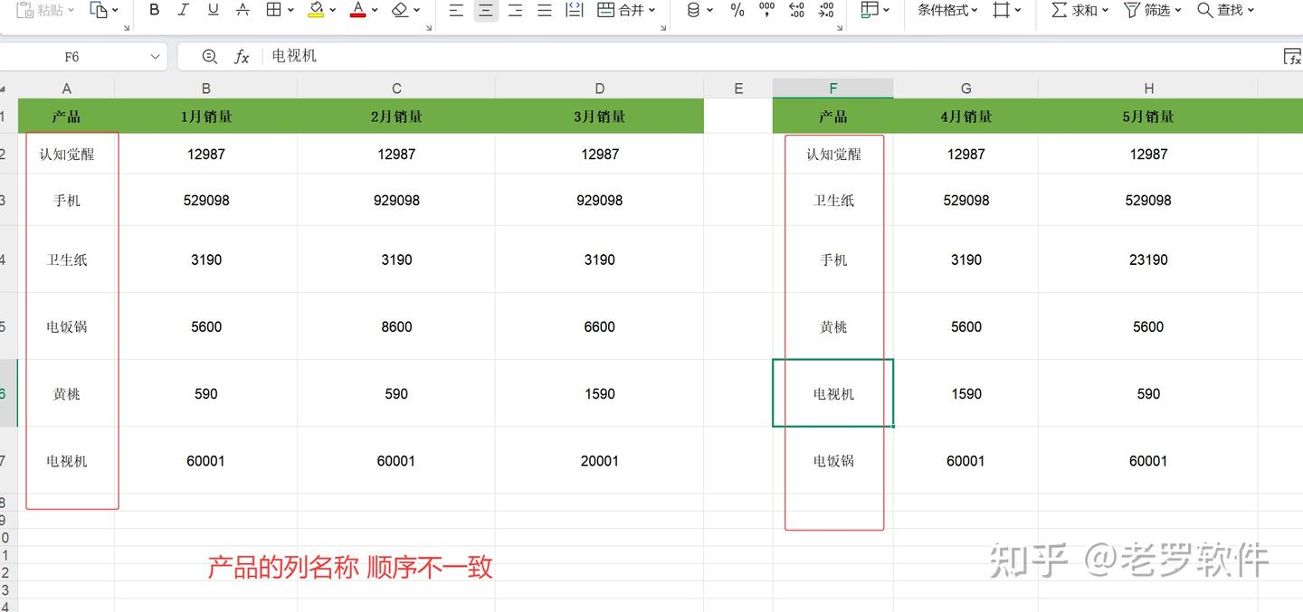 两张表都在同一个excel内, 也就是同表对比 。 由于现在每行的产品都是相同的,也就是同表的顺序对比。 如果顺序不一致,就是同表乱序对比,如下图: