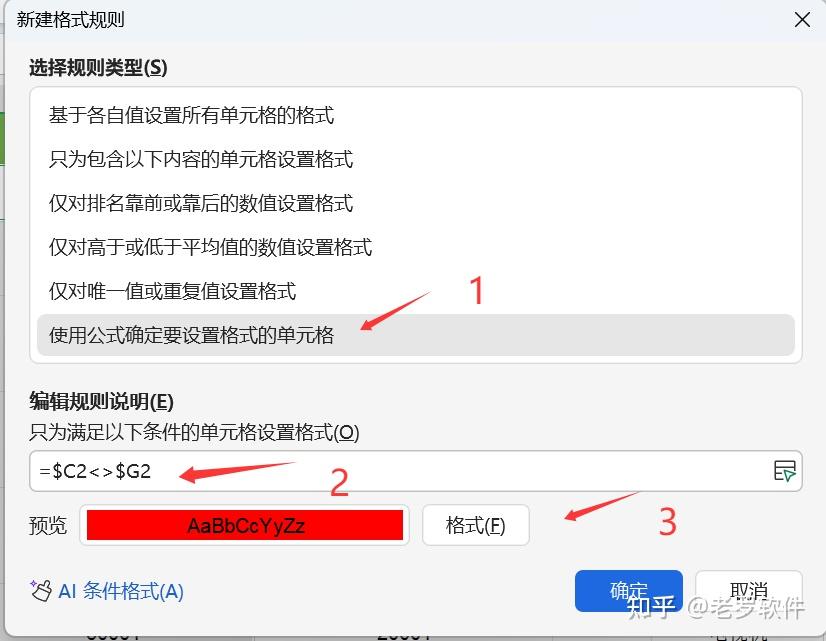公式解释:这个公式的意思是“判断 A2 单元格的值是否不等于 B2 单元格的值”。 注意:这里的 A2 和 B2 是您选中区域(即 A2:A10)的第一个单元格。$ 符号是绝对引用,确保在比较整行数据时,始终是 A列 与 B列 同行比较。