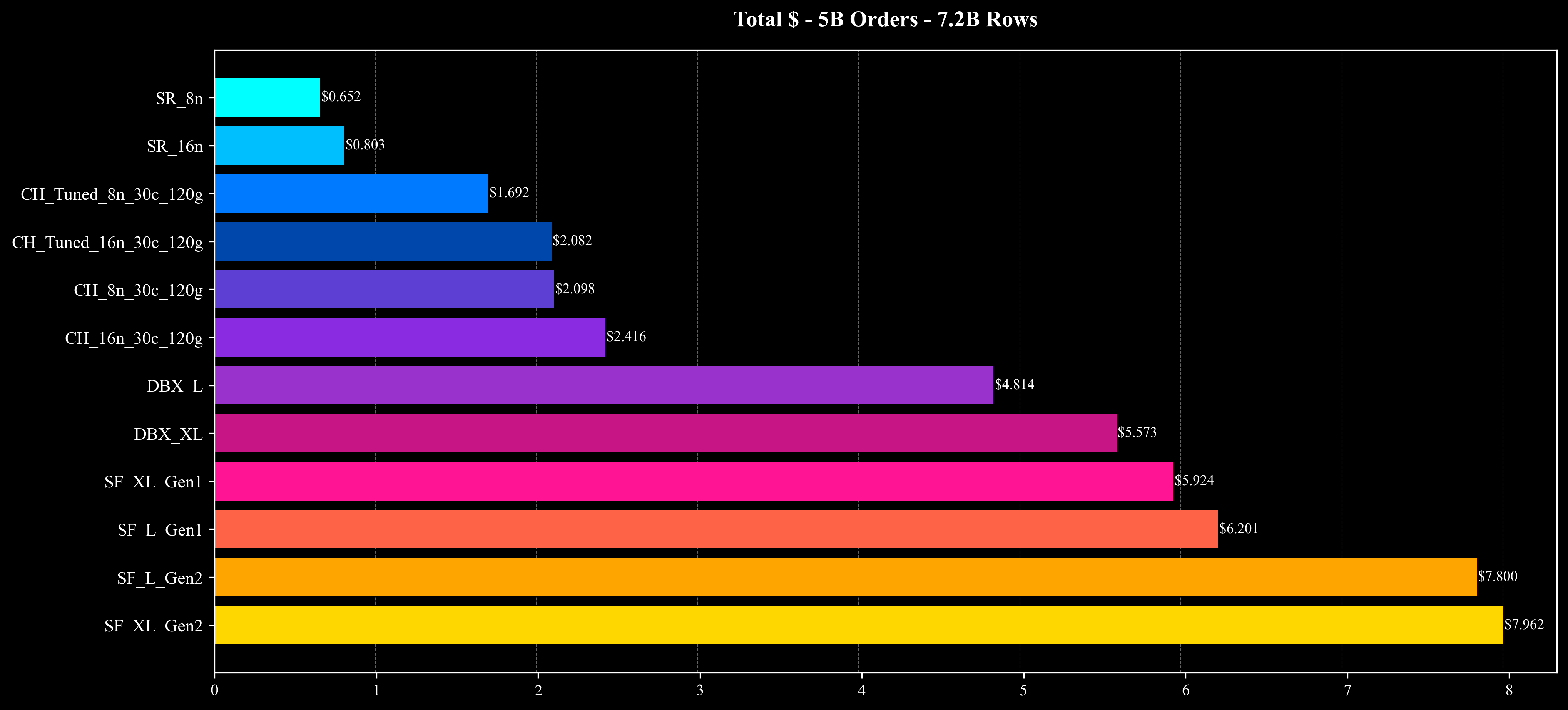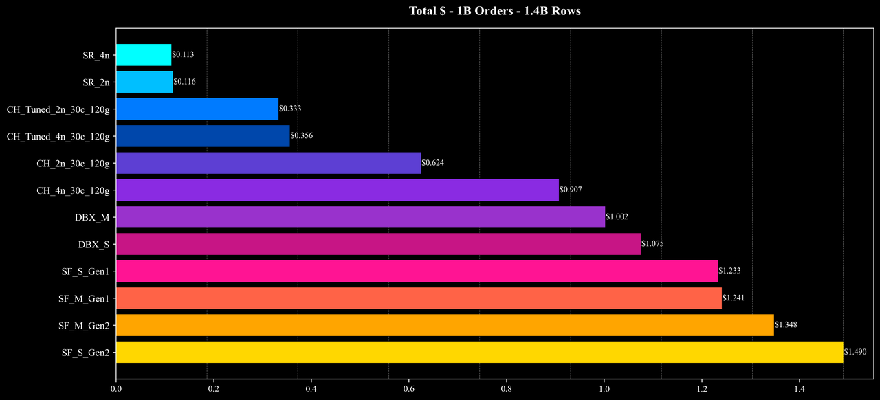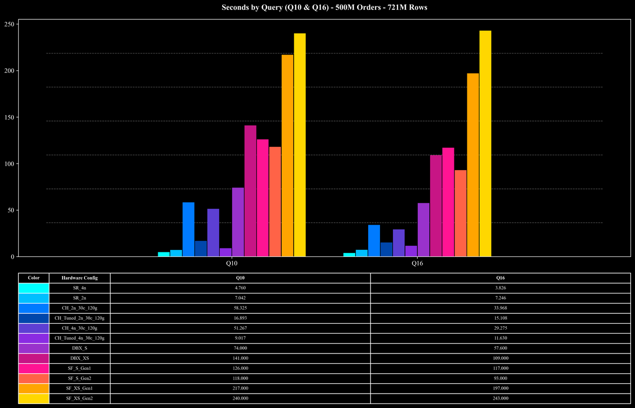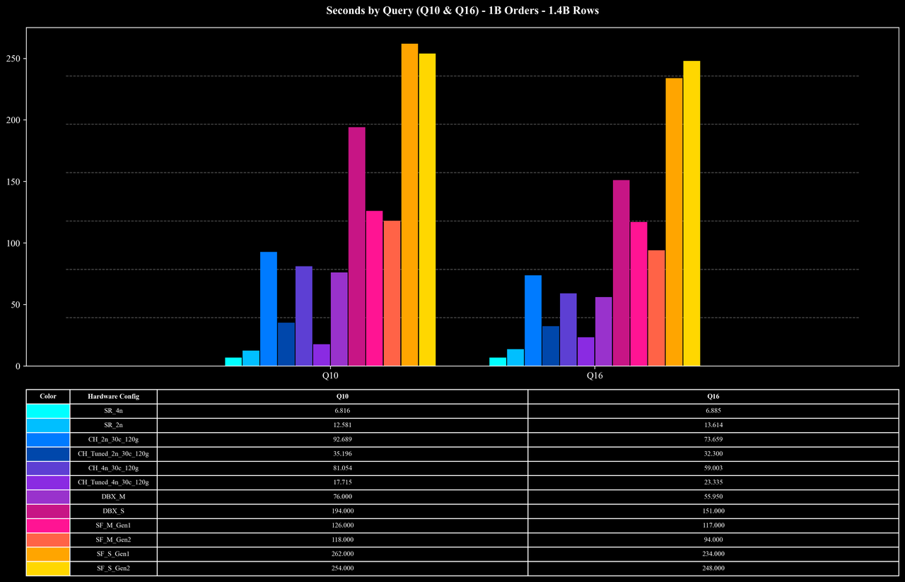 结果显示,在这些涉及大量 Join 与高基数聚合的复杂查询中,StarRocks 以更低的成本和更短的运行时间完成了全部测试,整体性能与成本效率较参考系统提升约 2–10 倍。