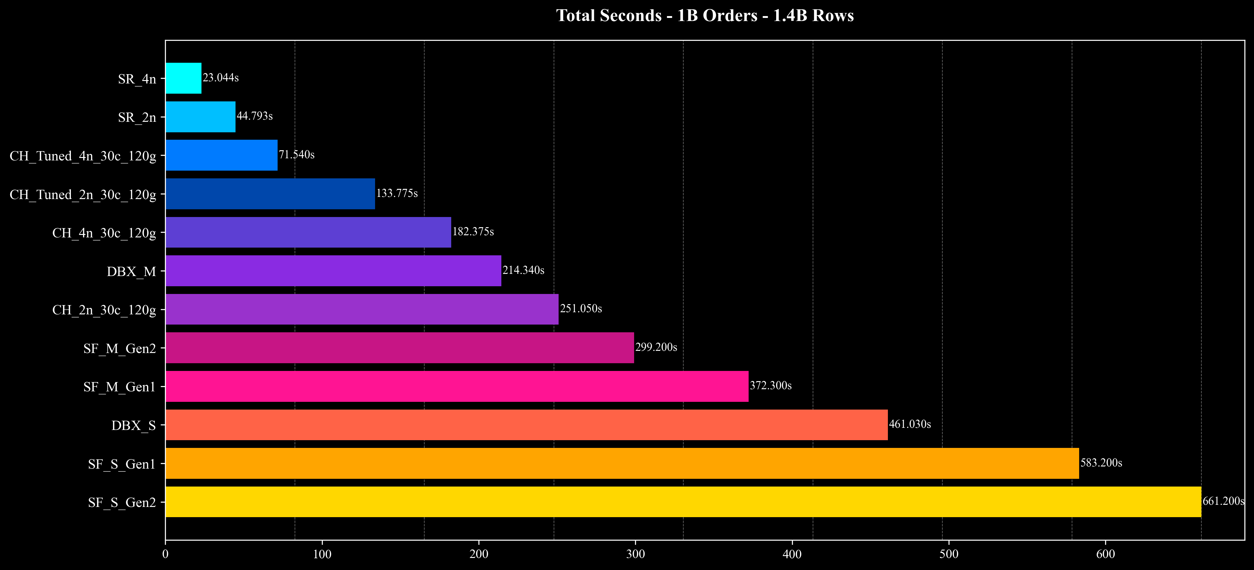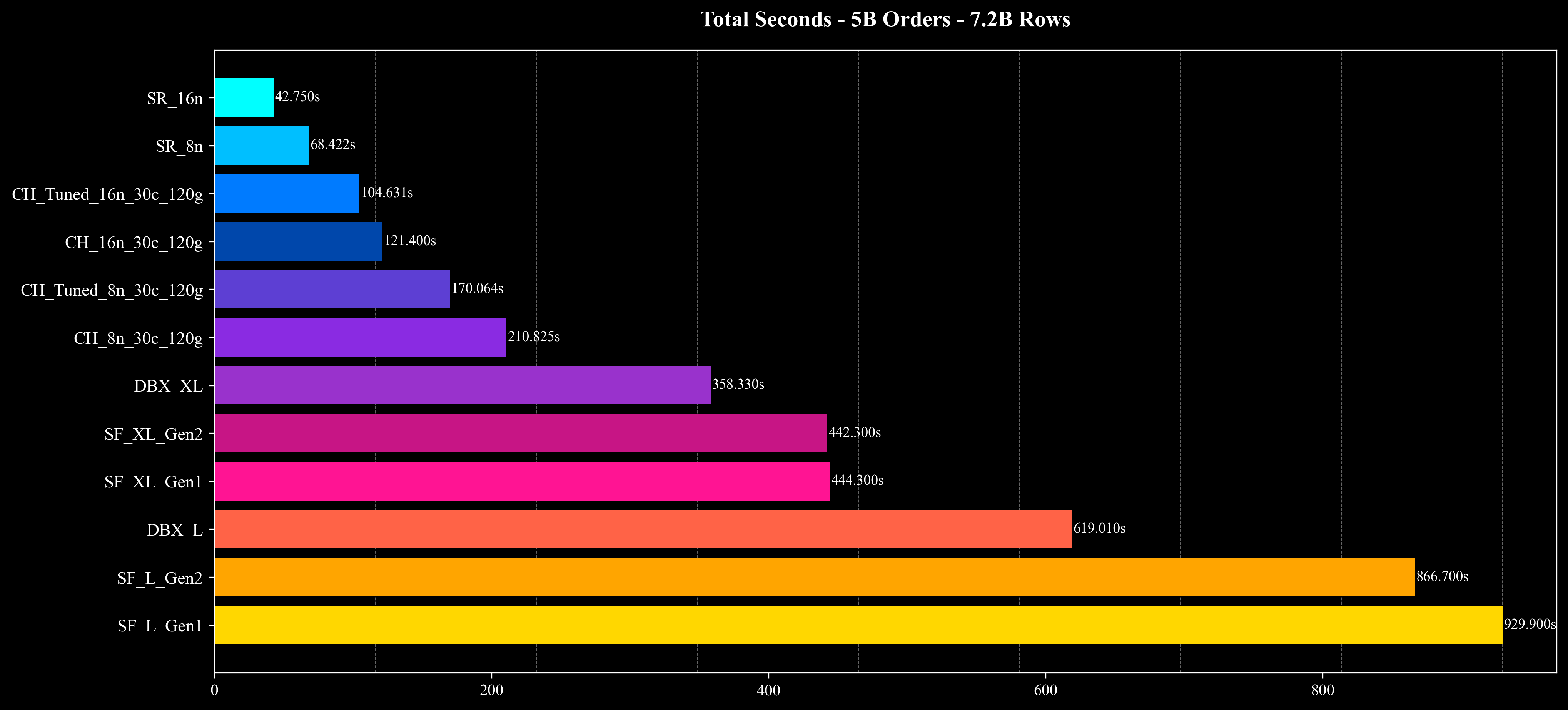 对比系统(ClickHouse、Snowflake、Databricks)的结果参考了已公开的研究与博客 [2–6],并在相同数据规模(500M、1B、5B)下进行对比,用于评估整体运行时间与成本效率。