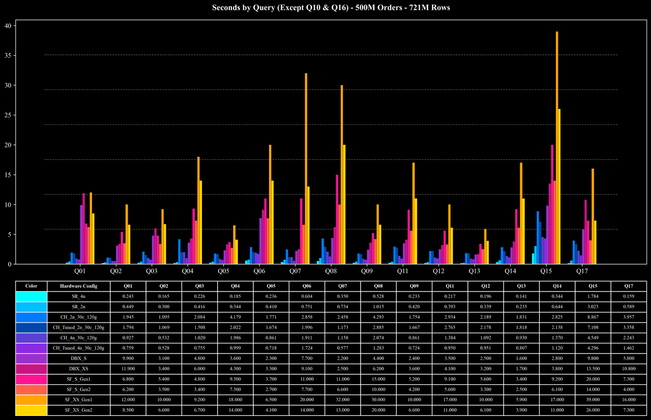 出于研究兴趣与工程验证,我们在相同的测试逻辑与实例规格下,复现了 Coffee-shop Benchmark 的 17 个查询 [1,4],并在 StarRocks 上完成了 500M、1B、5B 三种规模的数据集验证。