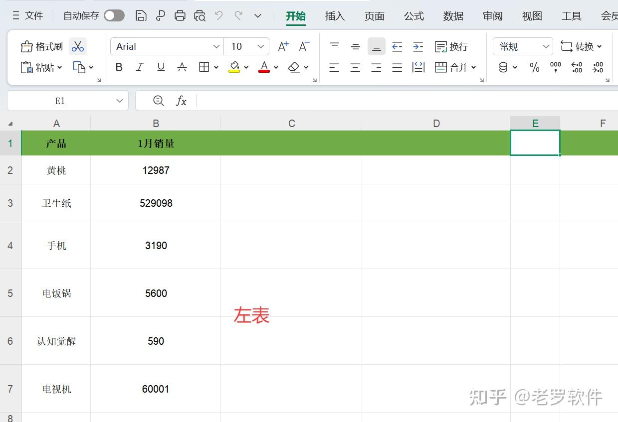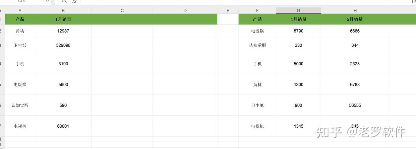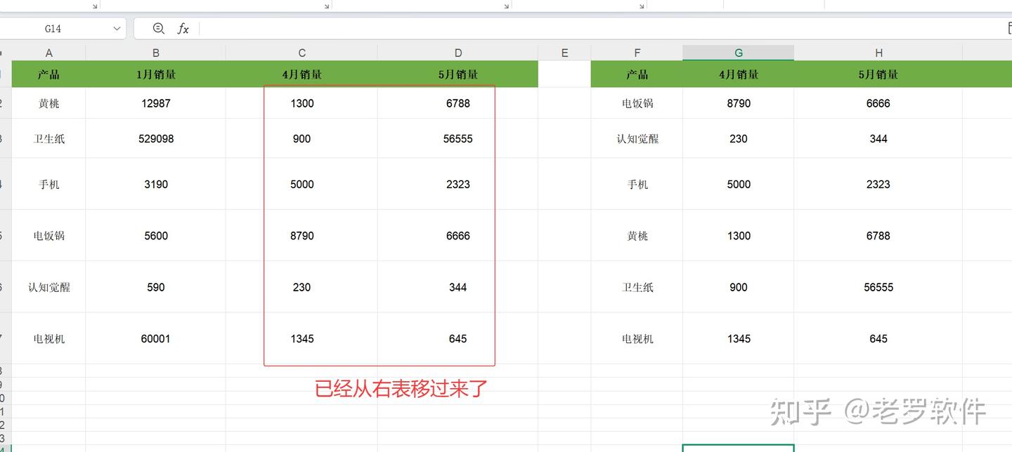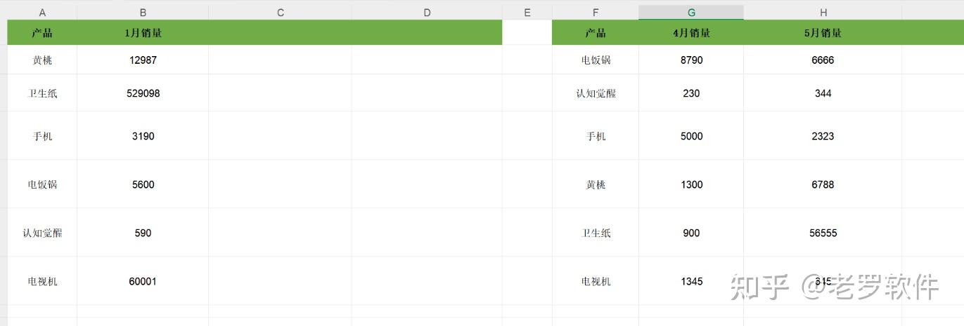 有一个excel, 内部有两个表,需要把右边表的4月,5月销量合并到左边表的1月销量的后面,根据产品名称来匹配。 如下图: