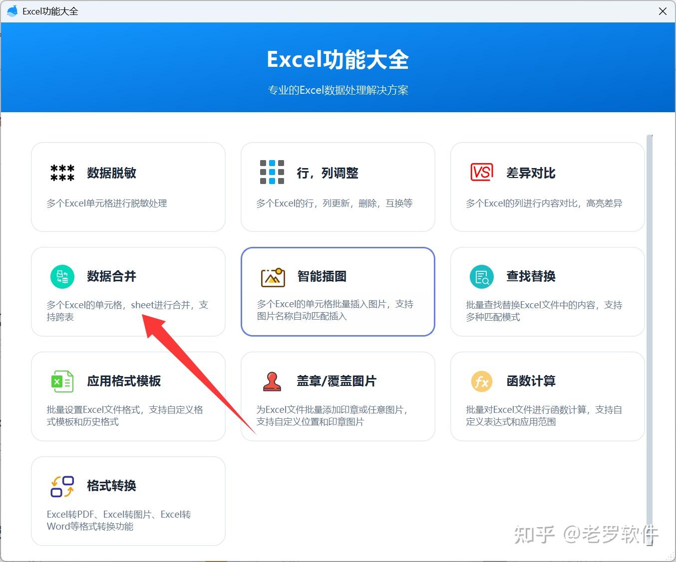 这是一个专业解决excel多文件处理的方案, 找到 Excel功能大全, 然后在弹出的框里点击 ”数据合并“