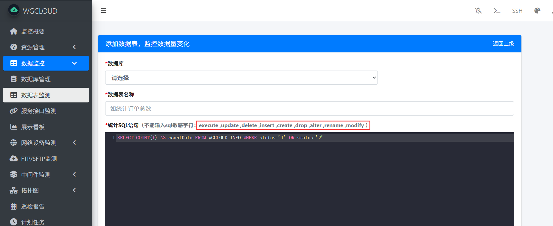 WGCLOUD在监控数据库和数据表时候,系统默认不能输入敏感的sql字符串,默认包括: