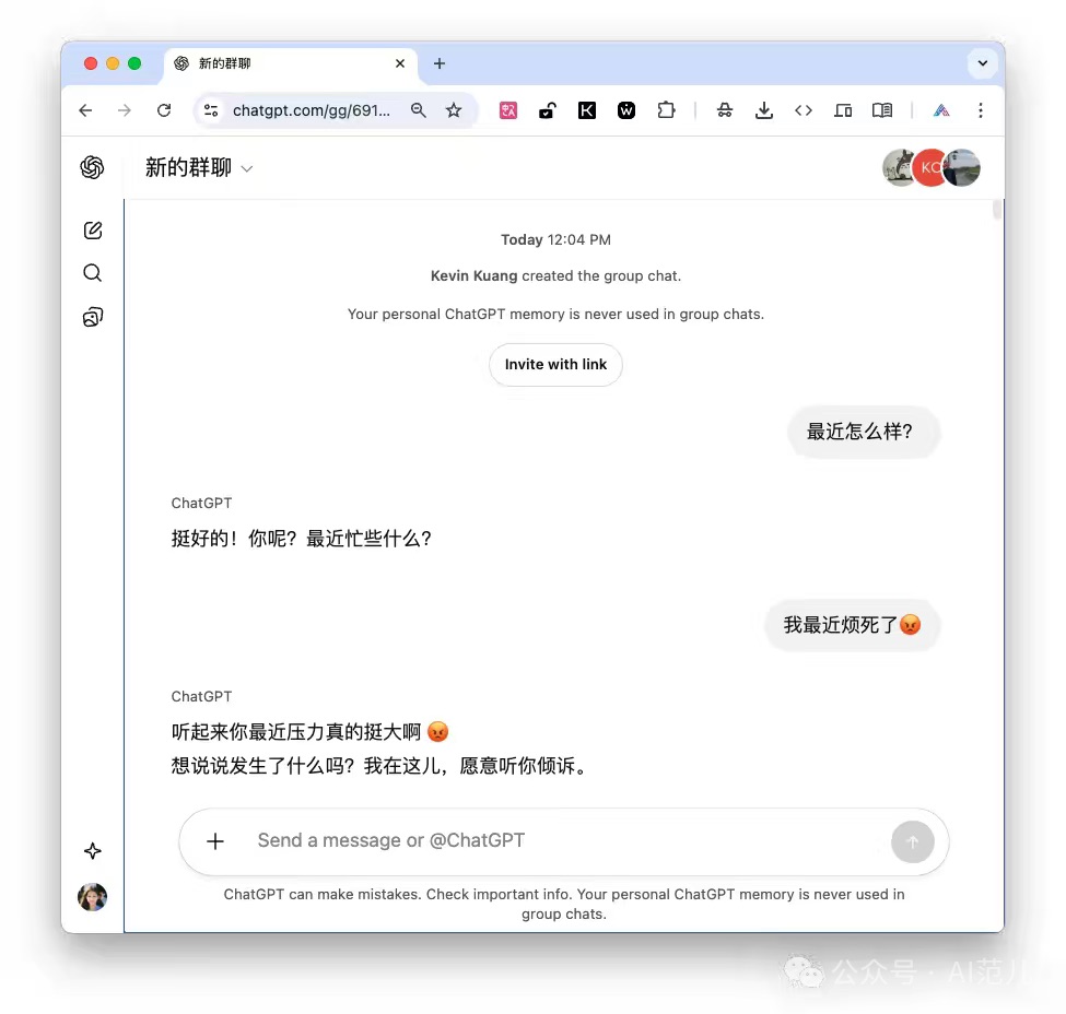 这项新功能支持最多20人同时在一个对话中与ChatGPT互动,覆盖免费版至Pro版全套餐用户。要创建群聊,用户只需点击对话界面右上角的“人物”图标,生成链接并邀请他人加入即可。群聊会话会独立显示在侧边栏,与个人对话区分开来。
