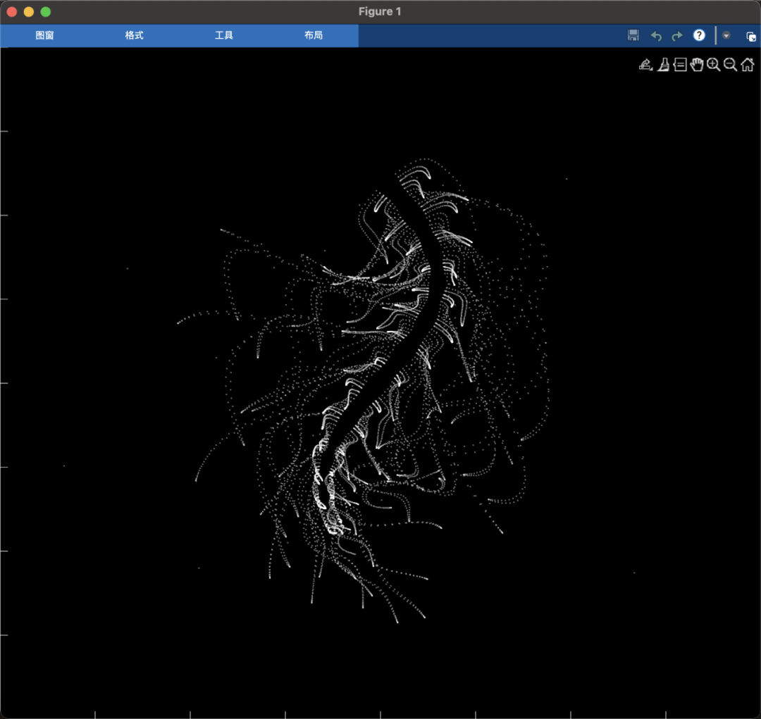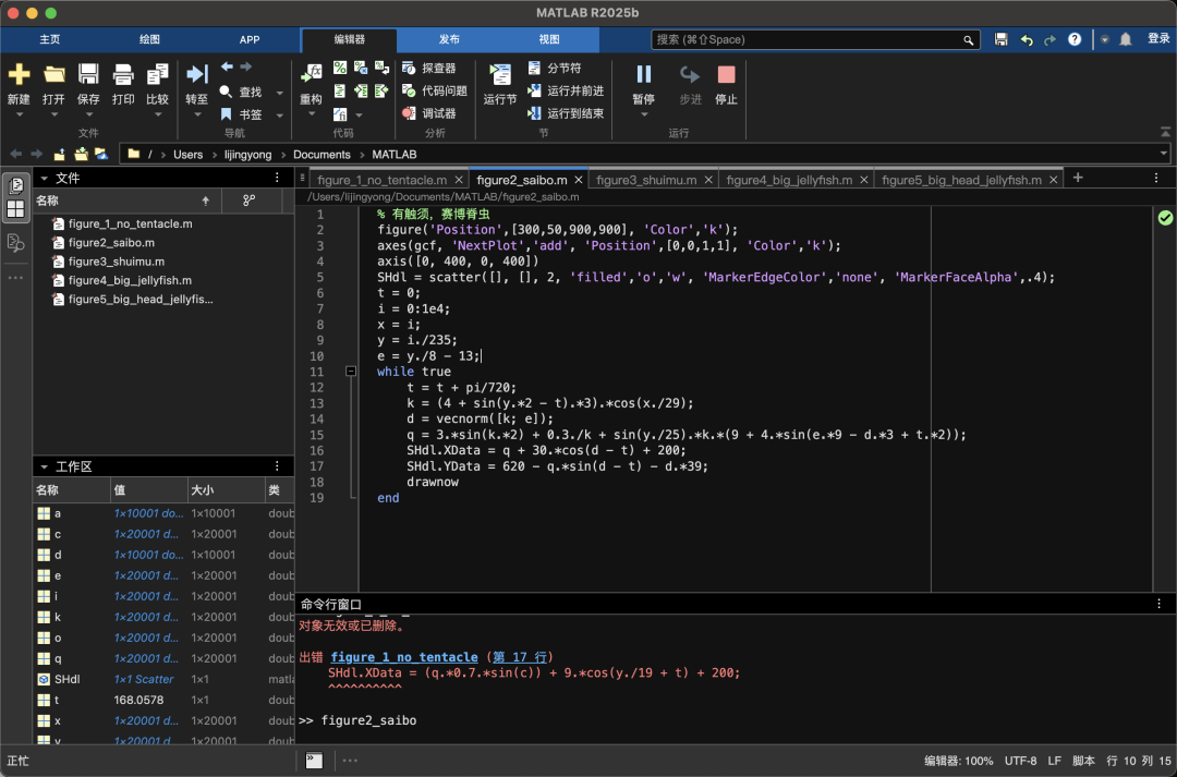 end如下图所示,在matlab中新建文件,把上述代码贴进去,并点击上方的运行按钮,我们就能在弹窗中看到这条赛博脊虫运动的状态了。