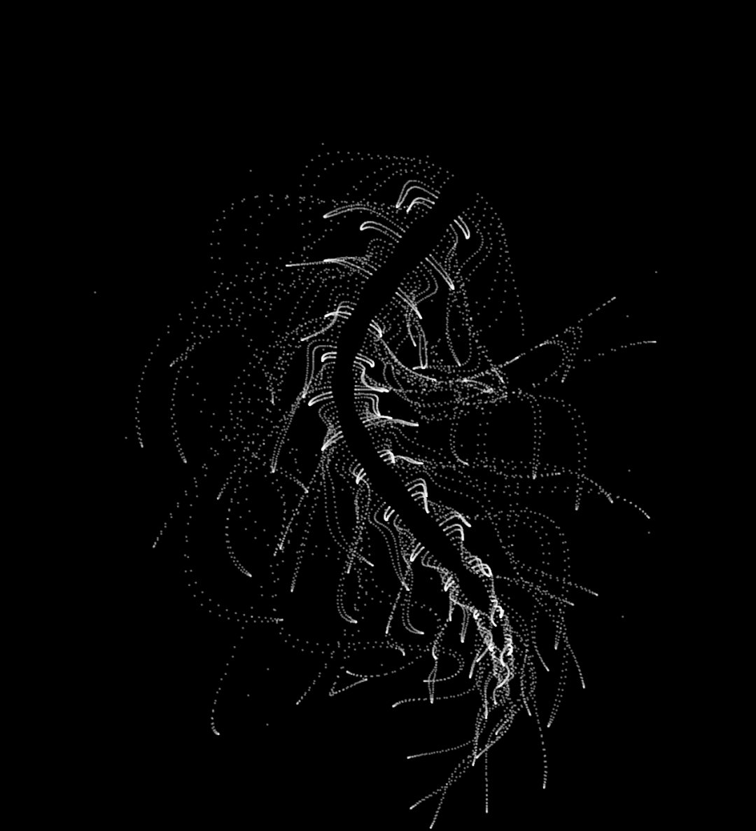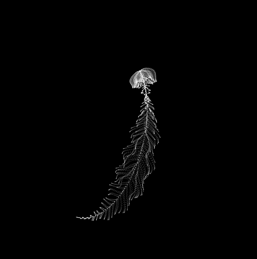 本质上是一个参数化的粒子系统,每个粒子(i)的位置由上述公式决定,通过时间t的变化产生连续的变形和运动,形成类似生物脊骨和触须的视觉效果。具体特点包括: