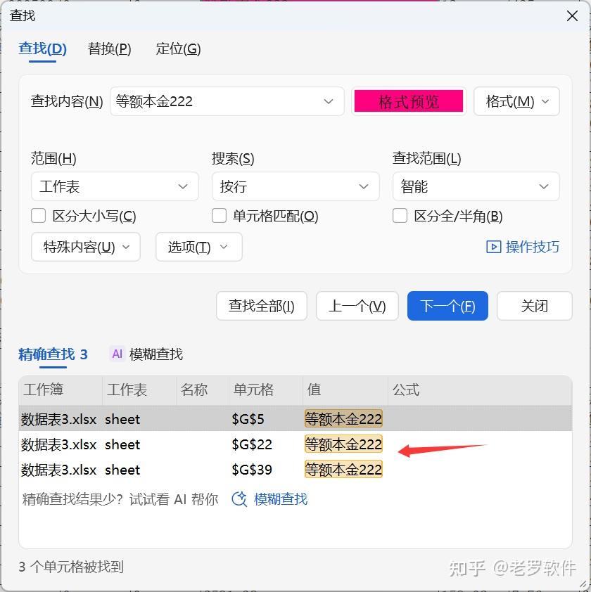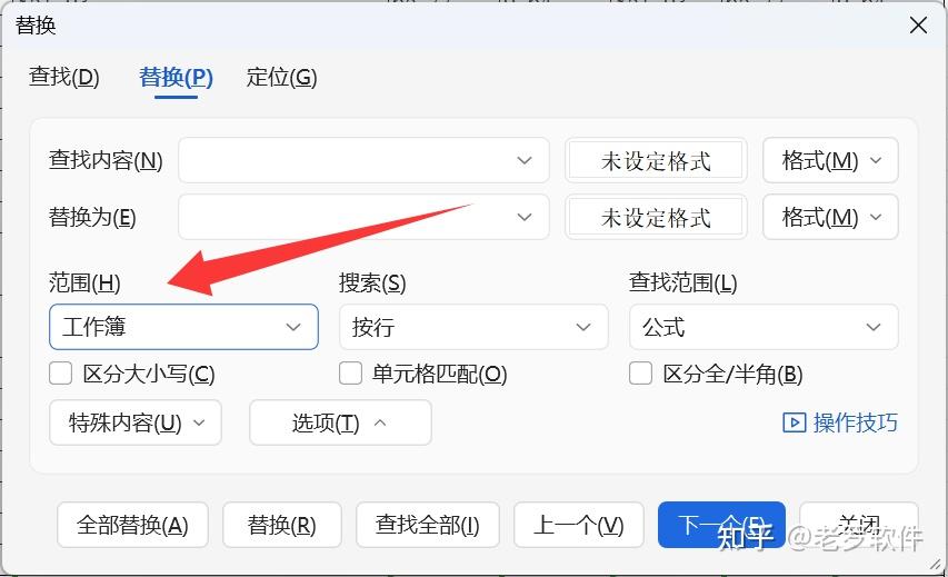 默认选项,仅在当前激活的工作表中查找。如果要在所有sheet中进行查找替换,就将范围改成“工作簿” 。