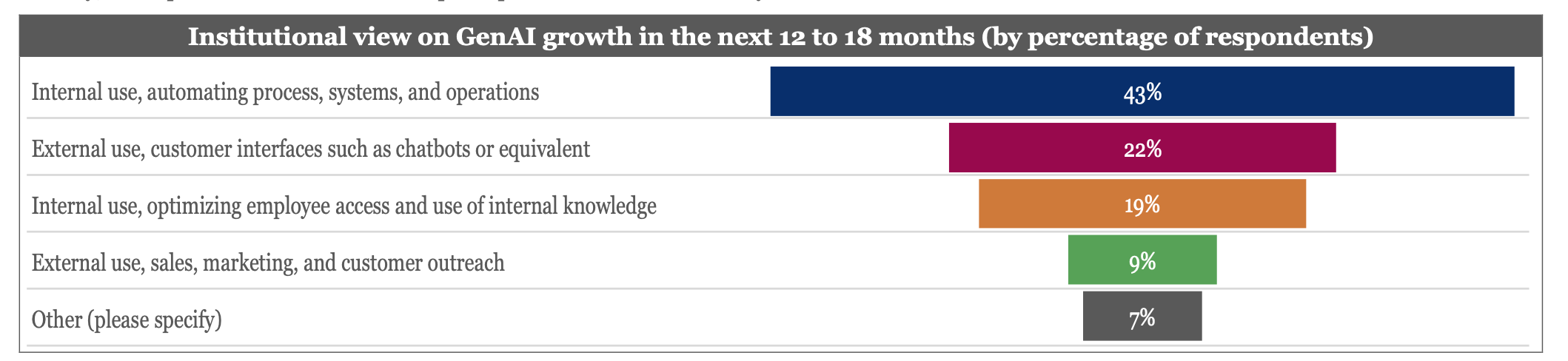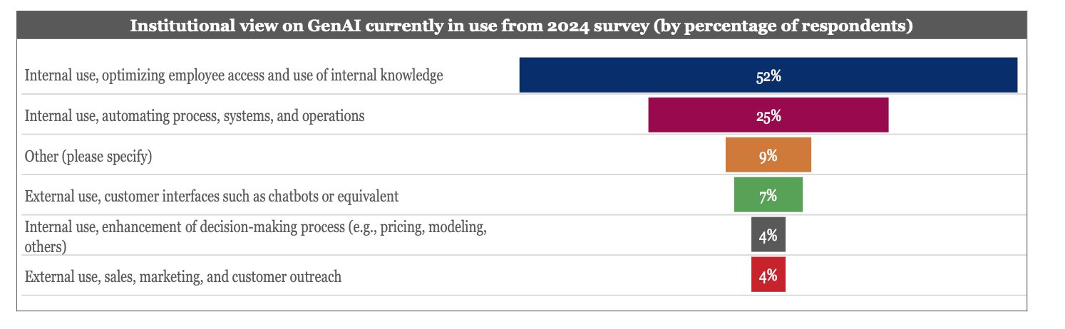 然而,主流化不等于轻率部署。金融机构展现了极端的审慎,将实验严格限制在内部。数据显示,高达百分之八十的GenAI用例是面向内部员工或流程的,只有百分之十一的用例直接面向外部客户。
