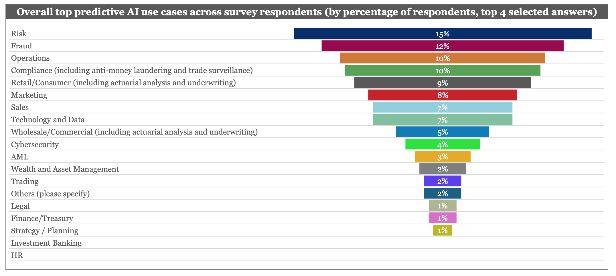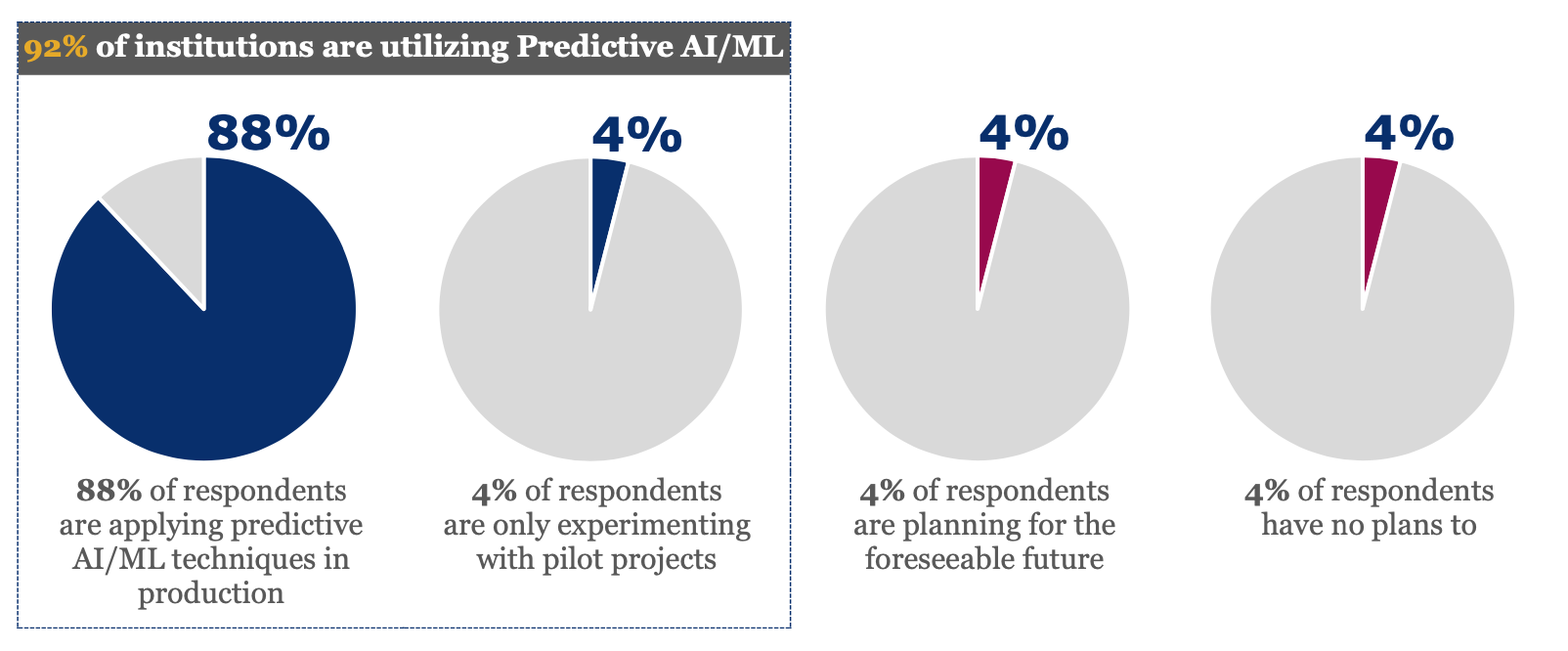 金融行业对人工智能的信心,首先建立在预测型人工智能(Predictive AI)的广泛且成熟应用之上。调查数据显示,高达88%的受访机构已在实际生产环境中使用预测型人工智能技术。这表明,对于金融行业而言,人工智能早已不是概念,而是日常运营的基础设施。