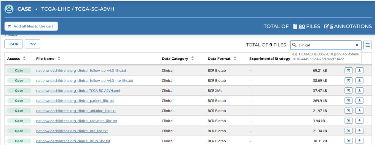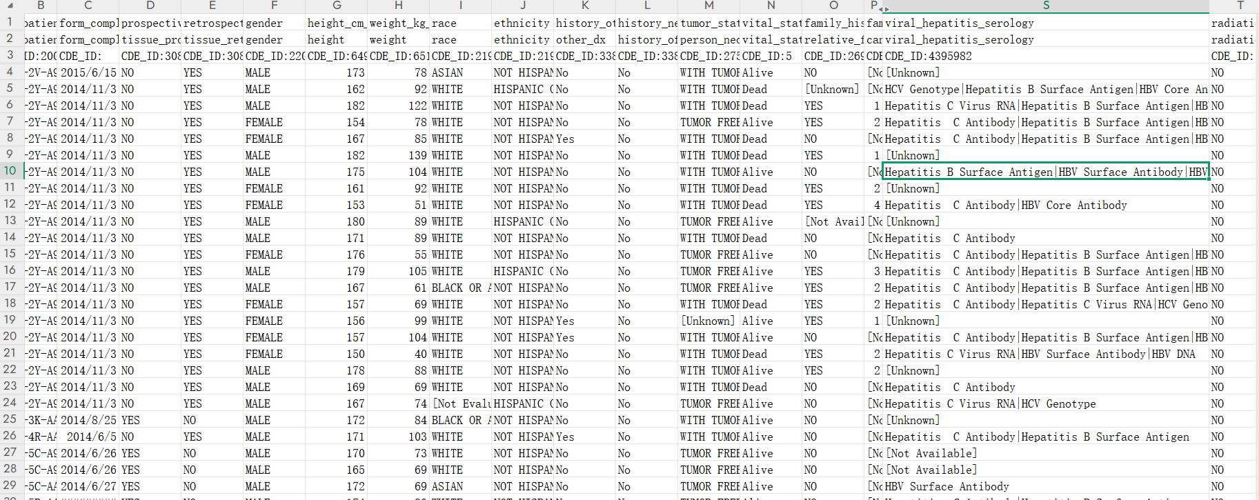 我们点击TCGA-lIHC看看,第一页基本是项目介绍,第二页是每个病人的介绍,这里我们可以点击一个case名来查看,滑到最下边,这里我们主要是可以下载一些隐藏的临床数据,例如乙肝丙肝的感染情况等。直接搜索clinical,例如nationwidechildrens.org_clinical_patient_lihc.txt这个文件,下载后我们可以看到表面抗体和核心抗体的情况。