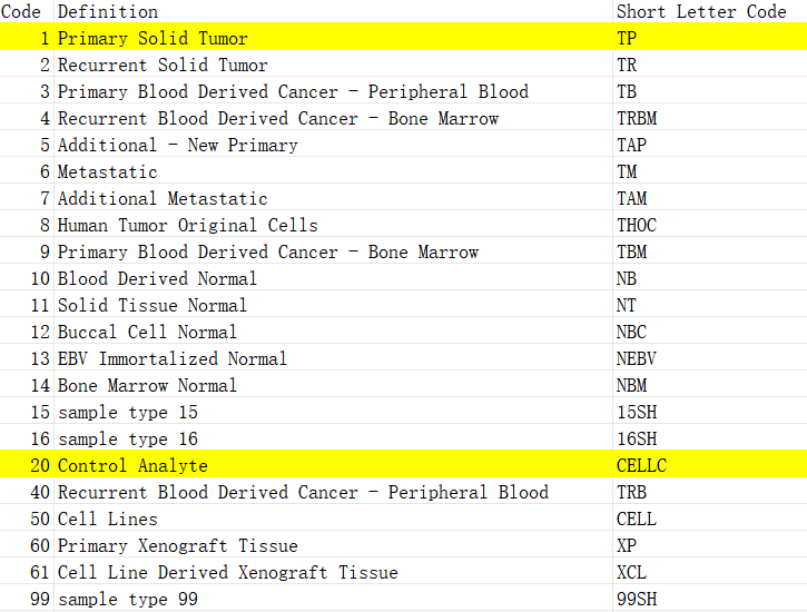 TCGA样本处理和命名方式参考https://docs.gdc.cancer.gov/Encyclopedia/pages/TCGA_Barcode/,代码表参考https://gdc.cancer.gov/resources-tcga-users/tcga-code-tables,我们可以发现一个病人的样本可能会分为多份进行测序,将命名TCGA-02-0001-01C-01D-0182-01分为六部分来看,TCGA为项目名,02为多形性胶质母细胞瘤,0001为病人号,01C为肿瘤的第三个样本(肿瘤类型范围为01至09,正常类型为10至19,对照样本为20至29),01D样本第一部分的DNA样本,0182为第182个96孔板,01为测序中心编号。其中,最终要的01C这个部分,我们用来判断是否为肿瘤,一般是01(原发性实体肿瘤)和20(对照)。