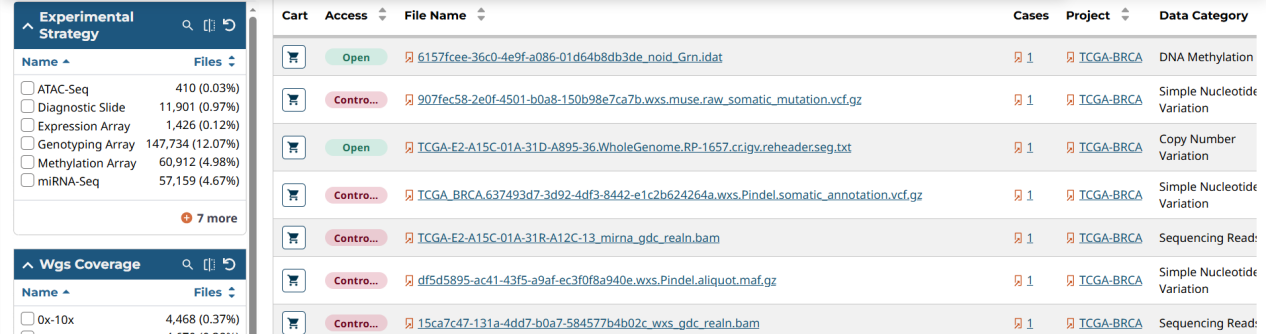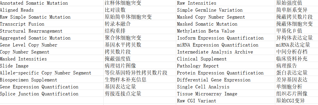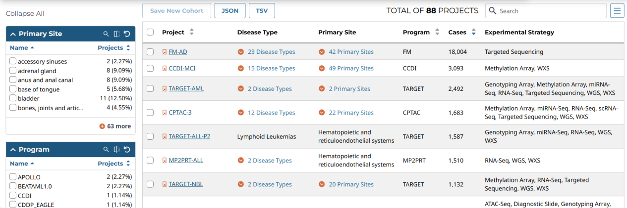 根据左边栏,我们可以发现数据被分为5个方面,分别为Primary Site发病位置、Program项目(可以理解为不同数据库)、Disease Type是疾病类型、Data Category为你要下载数据的类型,例如突变或者转录组。