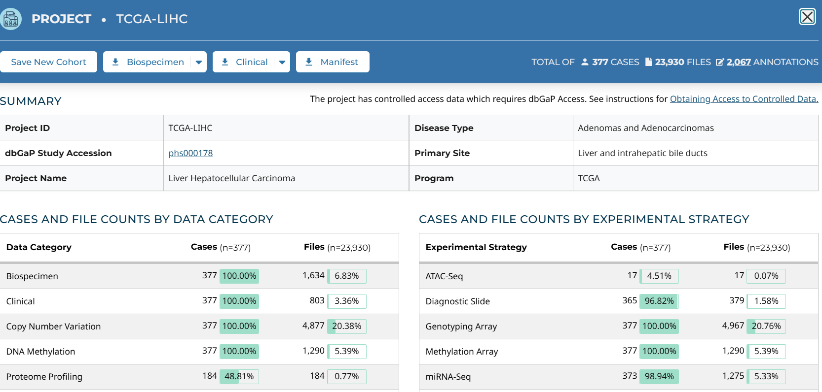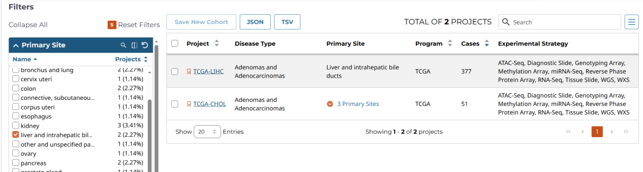 我们设置liver and intrahepatic bile ducts、TCGA、adenomas and adenocarcinomas、Transcriptome Profiling(转录组分析)、RNA-Seq来看看。我们发现最终有两个数据项目被选中,分别是TCGA-CHOL(胆管癌) 和 TCGA-LIHC(肝细胞肝癌)。Experimental Strategy为包含的可下载测序类型。