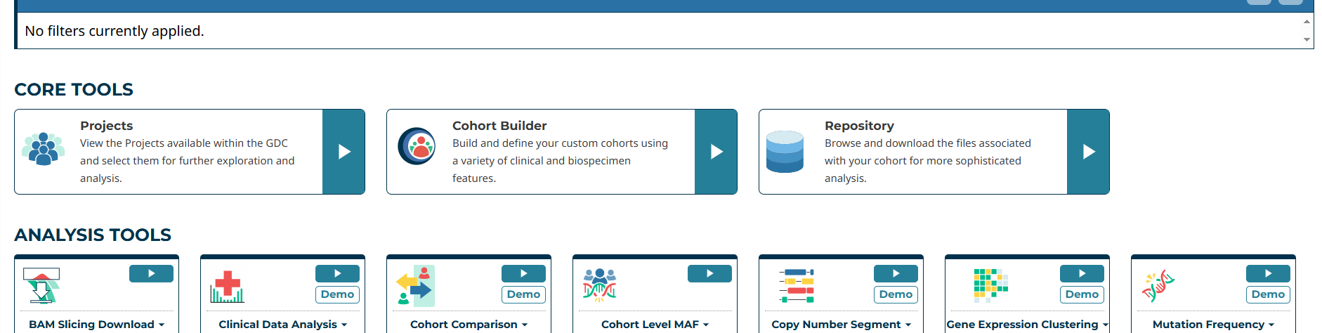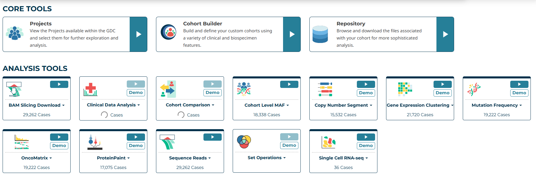 我们可以通过https://portal.gdc.cancer.gov/来访问,我们可以看到其包含了几乎所有器官的数据并且展示了总体数据的总结。注意,不要用网页翻译,否则会崩溃。