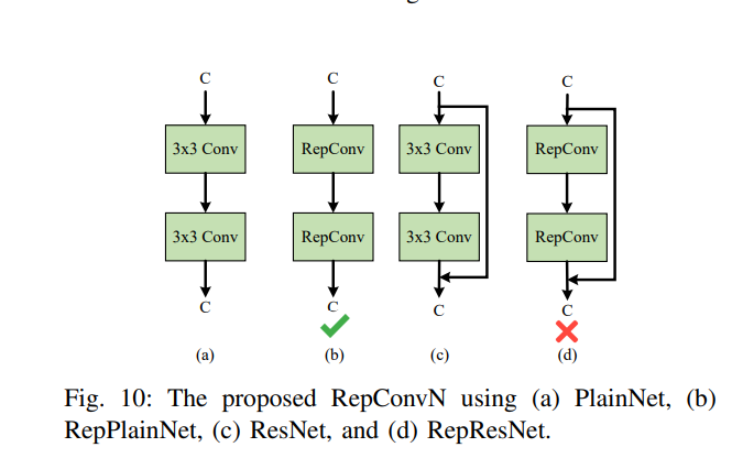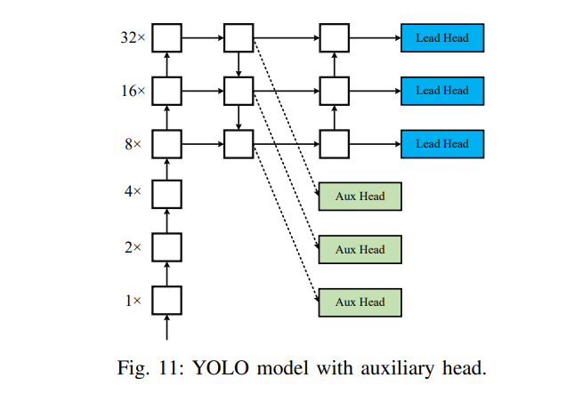 主要改进包括: • 在重参数化卷积(RepConv)中,恒等连接会干扰ResNet的残差连接和DenseNet的拼接连接。而RepConv需保留能为不同特征图提供梯度多样性的特征。因此提出新型重参数化方法[58]替代恒等连接,针对ResNet设计的重参数化卷积称为RepConvN(无恒等连接的RepConv)。由于图10(a)的PlainNet本身无残差/拼接特性,可直接应用图10(b)的RepConv;而图10(c)的ResNet本身具有残差特性,使用图10(d)的RepConv会导致精度下降。故YOLOv7采用RepConvN设计网络。 • 通过辅助机制训练浅层权重以提升精度,并引入由粗到细的动态标签分配策略。最终输出头称为主导头,辅助训练头称为辅助头(结构如图11)。