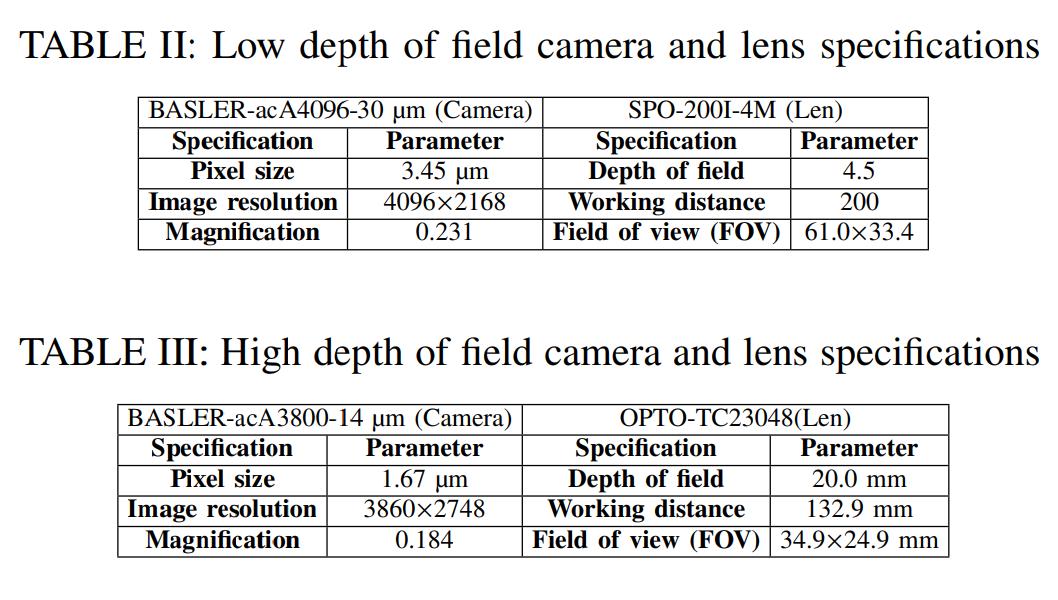 检测过程中,DIP元件在生产线上采用倒置安装方式。因此,顶部检测采用由下往上的图像采集方式,底部检测则采用由上往下的图像采集方式。DIP元件的正面与背面检测则通过左右两侧的两组相机完成。通过设备旋转机构实现侧边成像,使得两侧相机能够捕捉各个侧面的图像。其中,较长边对应DIP元件的上、下、前、后四个面,较短边对应左右两个侧面。为全面检测矩形DIP的长短边,实验需要配置两组具有特定景深参数的相机与镜头:长边检测相机采用小景深配置,短边检测相机采用大景深配置。具体相机镜头参数详见表二与表三。
