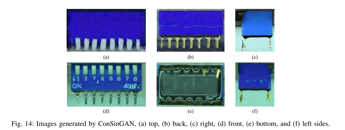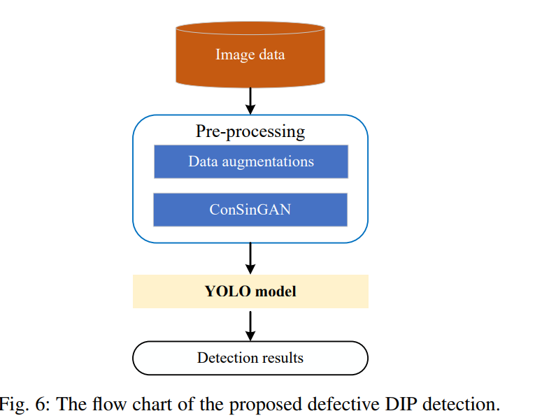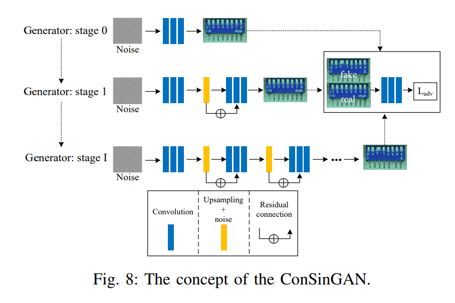 另一方面,自动化图像处理的主要挑战在于缺陷产品样本的稀缺。为扩充有限样本量,我们采用名为ConSinGAN的生成对抗网络模型[47][48]进行数据增强。ConSinGAN仅需单张图像即可构建模型,并能有效模拟生成图像中的缺陷特征,极大促进了检测模型的训练过程。而其他GAN变体(如DCGAN[49]或WGAN[50])则需要更多训练图像。本文的主要贡献如下: