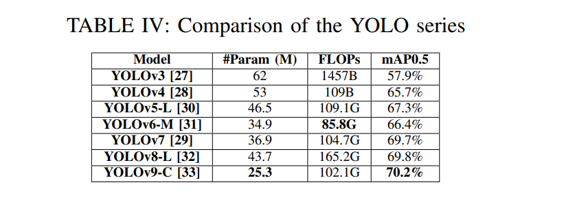 YOLO作为基于深度学习的目标检测算法,相较传统算法能在单一神经网络中快速完成目标检测与分类。其架构为包含多个卷积层和全连接层的卷积神经网络(CNN),将图像分割为S×S网格后检测各网格中多个目标。不同YOLO版本的筛选标准基于其浮点运算量(FLOPs)和平均精度(mAP)。表IV对比了YOLO v3至v9的性能指标,最终选择YOLOv7[29]作为DIP检测模型。实验中同时对比了YOLOv3[27]、YOLOv4[28]及最新YOLOv9[33]。由表VI可知,YOLOv7在精度上略胜YOLOv9但速度稍慢。YOLOv5[30]和YOLOv6[31]在FLOPs指标上与YOLOv7相近,但mAP较低。YOLOv8的FLOPs比YOLOv7高63%而mAP仅提升0.1%,因此未纳入主实验。