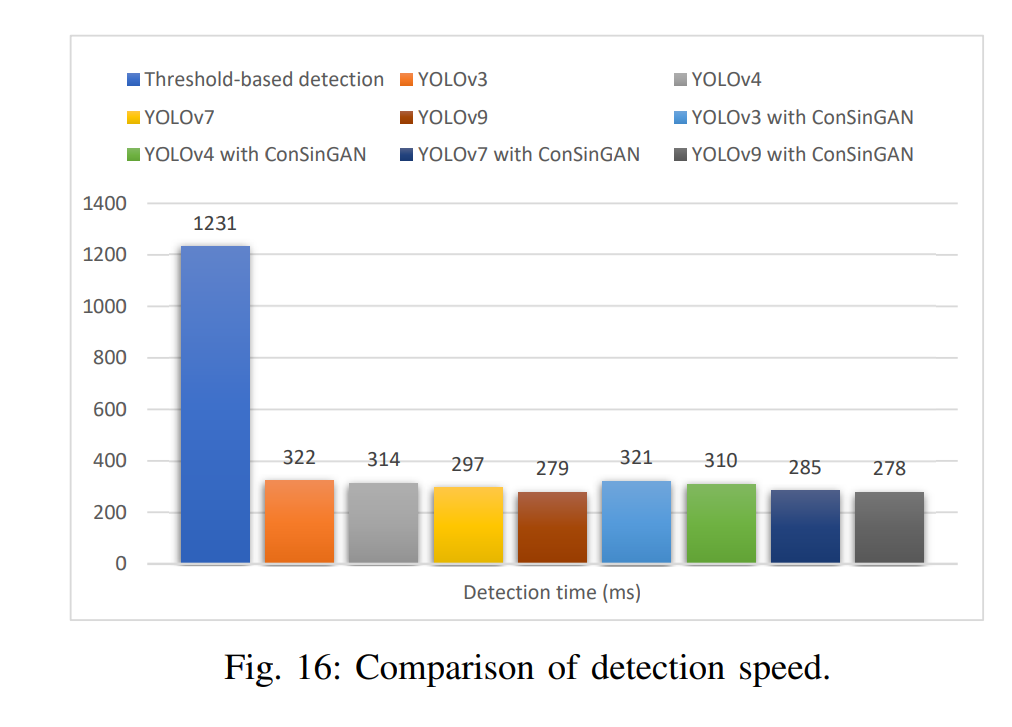 本实验共涉及九种模型,具体包括:1) 基于阈值的检测方法;2) YOLOv3;3) YOLOv4;4) YOLOv7;5) YOLOv9;6) YOLOv3+ConSinGAN;7) YOLOv4+ConSinGAN;8) YOLOv7+ConSinGAN;9) YOLOv9+ConSinGAN。各模型超参数设置如下: