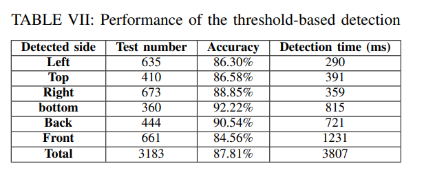 表VII显示六面检测的平均准确率为87.81%,总检测时间为3.807秒(该时间取决于耗时最长的工站)。相比阈值法,提出的YOLOv7+ConSinGAN方案将准确率提升至95.5%。