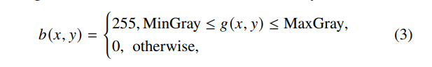 其中𝑏(𝑥, 𝑦)表示基于二值决策的特征图像像素,𝑔(𝑥, 𝑦)为原始图像像素,MinGray为最小阈值,MaxGray为最大阈值。