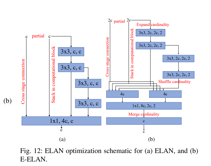 • 通过优化ELAN(图12(a)控制梯度路径长度,使深层网络有效学习。但堆叠更多CNN层会破坏稳定性,因此提出E-ELAN(图12(b)在保持梯度路径的同时,通过基数扩展/混洗/合并持续提升学习性能。