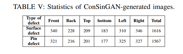 生成对抗网络ConSinGAN的超参数设置为:学习率=0.1,训练阶段数=10,原始图像使用第二章所述的工业相机采集。原始图像总量为672张,从中选取具有显著缺陷特征的图像进行增强,最终生成图像总量达3,183张。