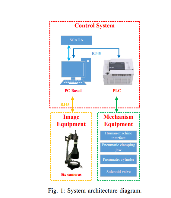该系统架构如图1所示,包含三个组成部分:1) 控制系统:由个人计算机(PC)与可编程逻辑控制器(PLC)设备构成。PC负责与成像设备交互并建立数据采集与监视控制(SCADA)系统,实现深度学习模型集成与数据分析功能。PLC则用于连接机械装备,控制各类执行动作,发送动作完成信号,并提供二次确认计数。2) 成像设备:包括工业相机、远心镜头及多种光源设备。成像设备通过以太网电缆(RJ45)与PC进行数据交互与传输。3) 机械装备:通过PLC人机界面进行控制,包含气动夹具、电磁推杆与电磁阀等执行机构。