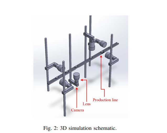 本系统设计用于检测工件的全部六个表面。每个检测面均在不同位置配备多组自动光学检测(AOI)单元,以最大限度减少不同表面受各类光源的干扰影响。图2展示了该系统的三维架构示意图,清晰呈现了AOI单元的布设方位以及实验夹具的设计方案。该设计通过不同角度的镜头与光源定位,实现了对矩形工件长边与短边的全面检测。