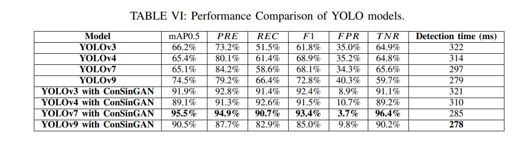 表VI展示了各YOLO模型结合ConSinGAN在mAP、精确率(𝑃𝑅𝐸)、召回率(𝑅𝐸𝐶)、𝐹1分数、假正率(𝐹𝑃𝑅)和真负率(𝑇𝑁𝑅)方面的性能表现。实验结果表明: