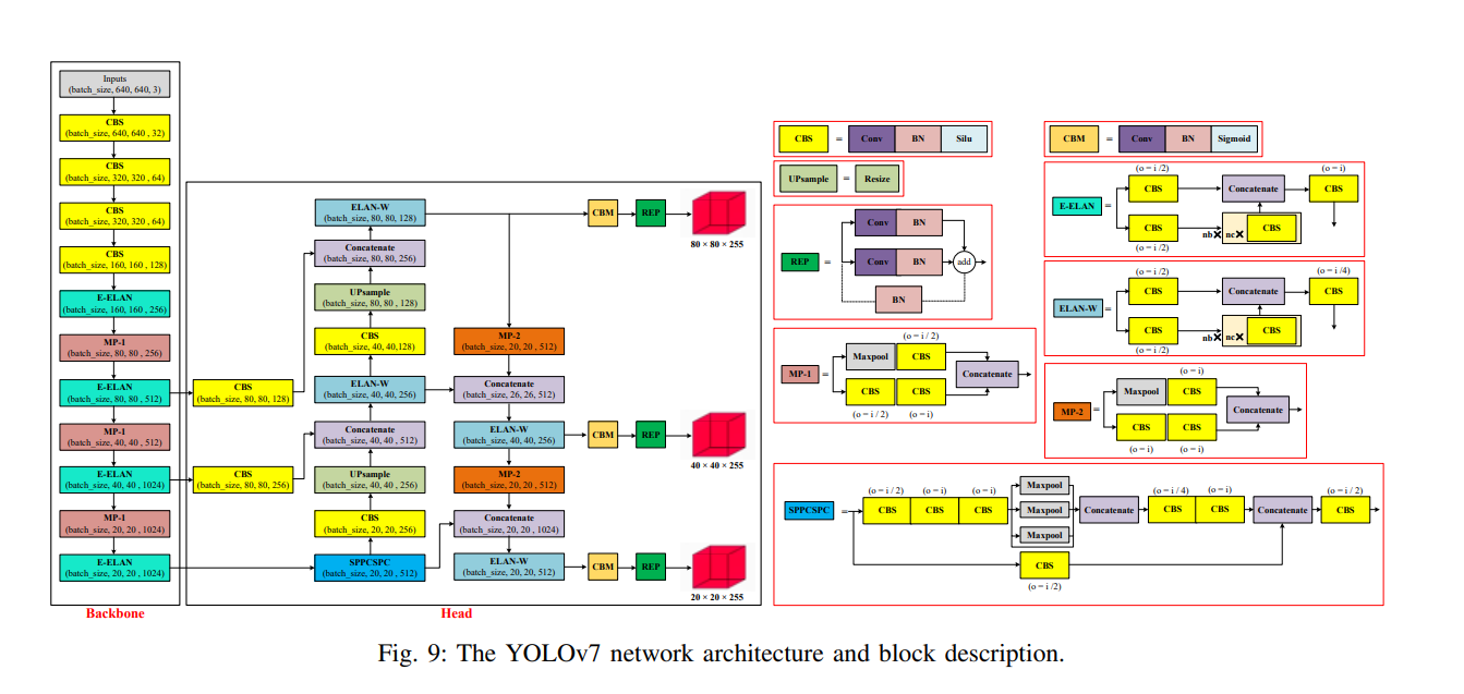 YOLOv7采用扩展高效层聚合网络(E-ELAN),通过扩展、混洗和合并操作使网络学习更丰富特征而不破坏梯度路径。检测头部分延续YOLOR[56]结构,其中: